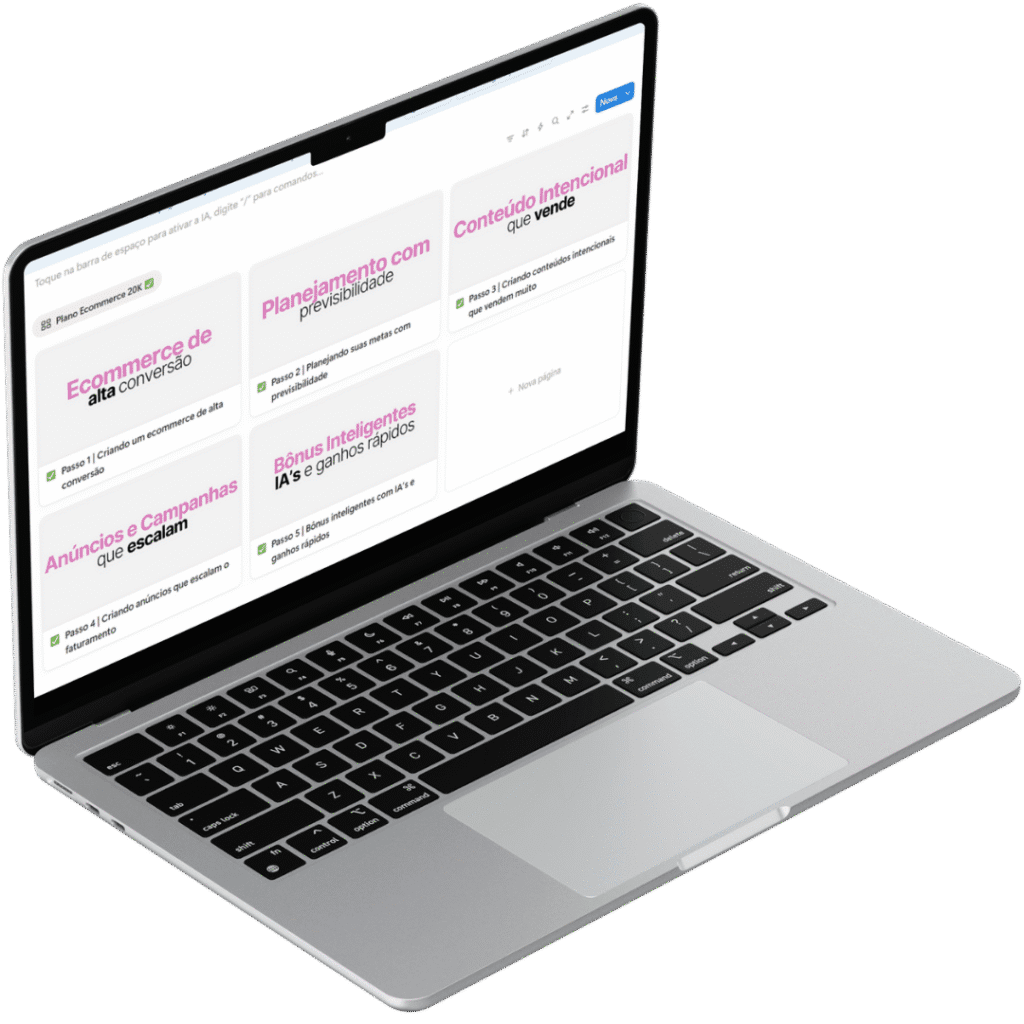 Eu criei cards dentro do Notion, separados em passos para você chegar ao fim do conteúdo com seu ecommerce otimizado, com as estratégias, conteúdo que vende e anúncios que escalam definidos e criados para começar a ter os primeiros resultados – TUDO PRONTO!